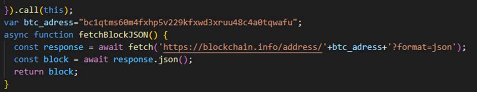 First the malware gets the Command and Control (C&C) domain from the transaction information of a given Bitcoin wallet (“bc1qtms60m4fxhp5v229kfxwd3xruu48c4a0tqwafu”). The queried website, Blockchain.info, is a benign website.