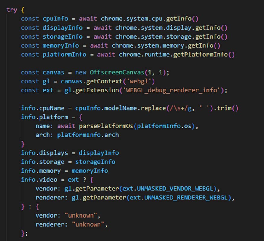 Based on our own information and information provided by law enforcement, it appears Genesis Market dropped and executed their own set of JavaScript (JS) scripts on the infected machines that were provided to them. This set of JS scripts were designed to grab all the relevant information from the victim’s machine in a structured way, ensuring the data quality across all the bots they were offering via their marketplace.