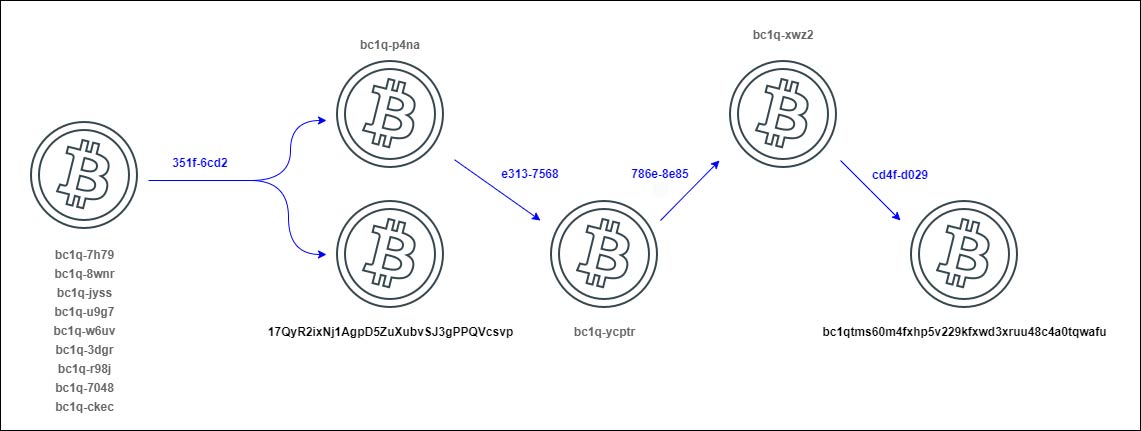 The bc1-wallet had one incoming transaction, coming from “bc1qkr46e27y9xh367n4pgdqjw544d2nlyxgwjxwz2” (note the different addresses, even though the start is similar). This address also received funds from other accounts that can be traced back to the BTC address "bc1qnvg0hqp343eewr08uh3fl86ggk4srtfwanp4na", which received money in a transaction (“351fe6493f9a97eb55bd6a4a678c63fcbe96edce0f09a074323ee5c95cb46cd2”) of 90 BTC from 9 towards 52 addresses. This transaction also contains an interesting Coinbase wallet (“17QyR2ixNj1AgpD5ZuXubvSJ3gPPQVcsvp”), which some researchers linked to Russian oligarchs when the Russo-Ukrainian war began. Please note, we don’t have all the underlying research documents and cannot verify the credibility of the linked research.