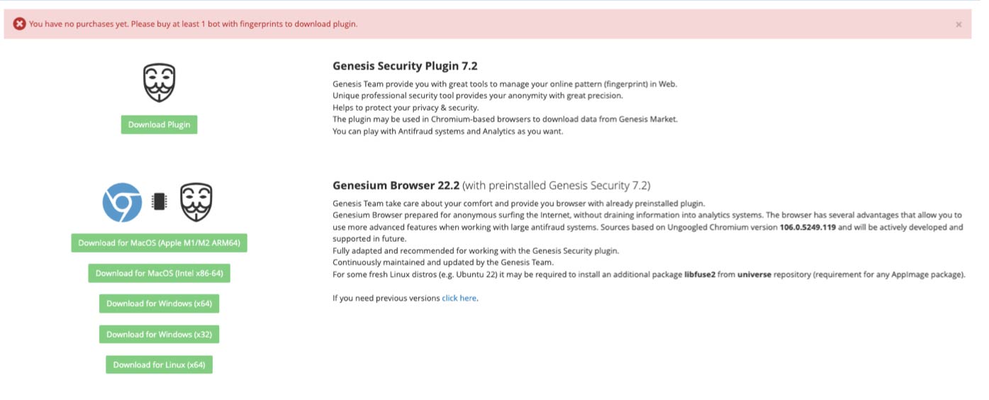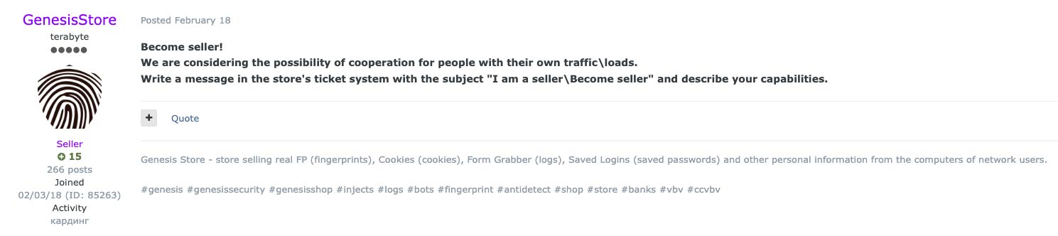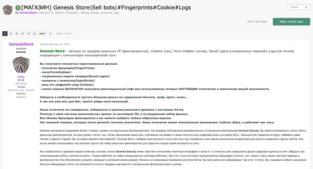 Genesis Market has been around since 2018 and is the largest underground marketplace that sells credentials, browser fingerprints, and browser cookies. Under the moniker GenesisStore, the Genesis team advertised on several (predominantly Russian speaking) underground forums.