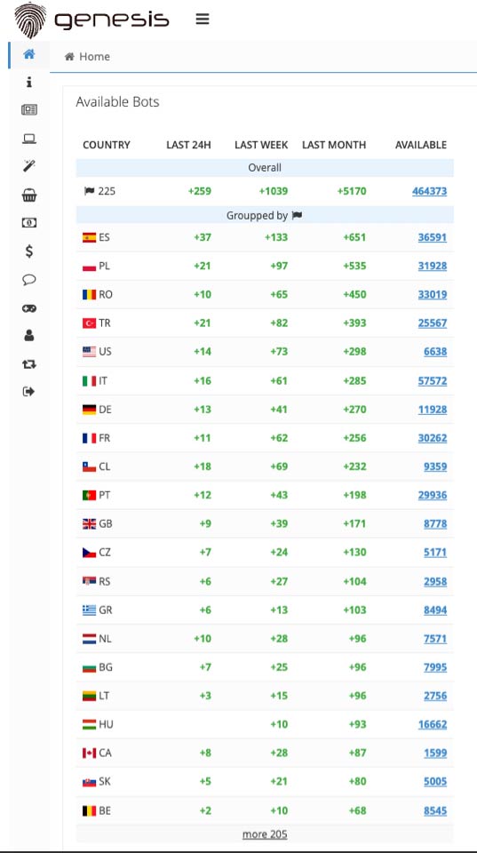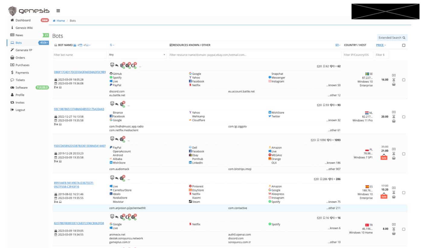 Genesis market also offered its users a unique specialized browser and plugin, called Genesium, that allowed for an easy injection of the stolen artifacts, making account takeover child’s play for cybercriminals. The market was an invitation only place which required referral from a current member to register. It is interesting to note is that most messages the Trellix Advanced Research Center found mentioning Genesis Market were from individuals asking for a referral, often prepared to pay money for said referral. When we examined the marketplace, we observed more than 450K listed bots (or infected machines). The official Europol announcement mentions a number of 1.5 million bots, this number differs from what we observed since we could only see the advertised data, not the full database including historic numbers. As you can see in the screenshot below, Genesis neatly organizes the different accounts and services it obtained from every victim, ranging from streaming services, web shops, and bank details, to corporate logins. Prices of bots varied per country and the number of available fingerprints.