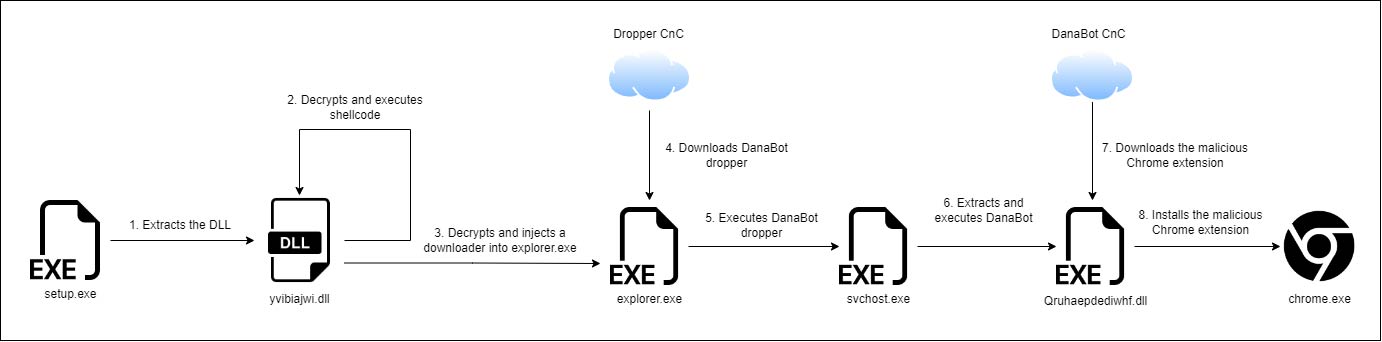 Based on forensic timestamps provided by law enforcement, the “setup.exe” file seems to be the initial infection vector. The file contains multiple stages, although not all of them could be analyzed due to an unreachable download location. The diagram below shows the different stages of this sample.