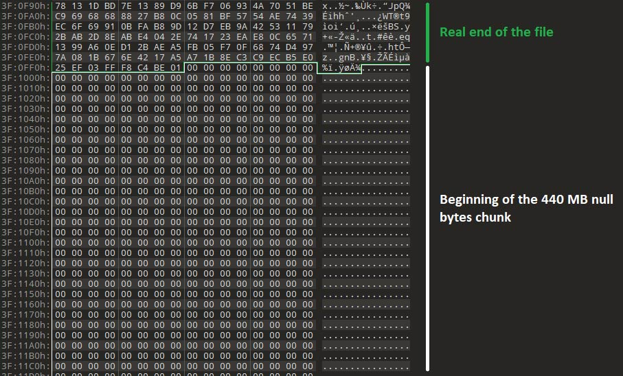 The executable’s size is inflated, as 440 MB (or 99.3%) is null padding. This technique to avoid sandbox execution isn’t new, but it has been used more often lately in recent campaigns, like Emotet and Qbot.