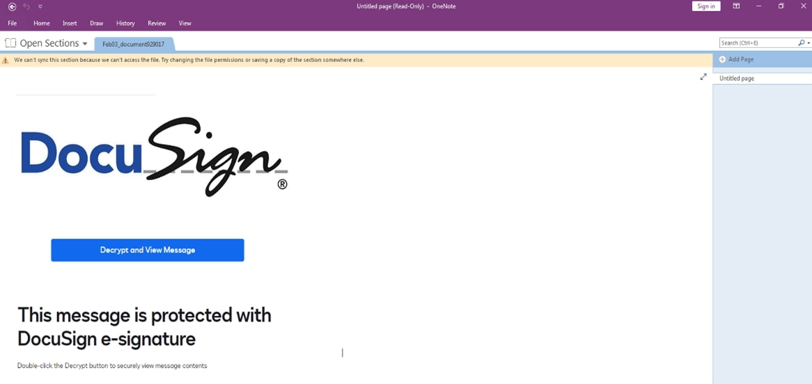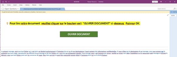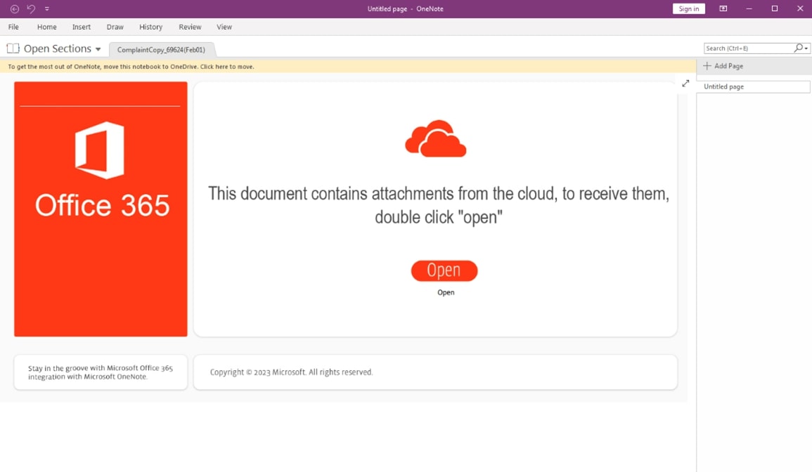 Figure 5 Screenshot of Office365 themed phishing OneNote document.
