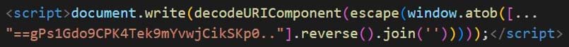 In Figure 21, the sample uses packing. First the script reverses the base64 encoded string and then decodes it. It is uses decodeURIComponent to escape any special characters then it is written to the HTML file using document.write.
