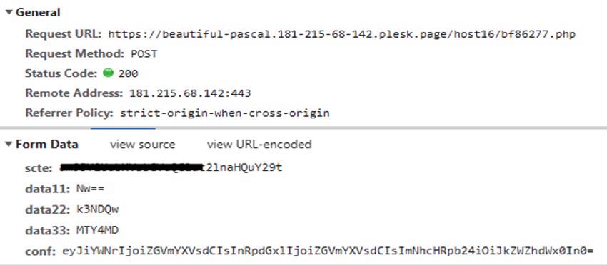 The code block 4 creates a post request with 4 parameters. “Scte” contains the email id. Data11, data22 and data33 when combined contains base64 encoded value of the time when the phishing page is executed. Conf value contains the value from div with id conf which is present in the original HTML attachment. Decoded base64 value is: {"back":"default","title":"default","caption":"default"}