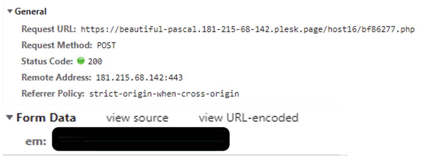 Just before the final phishing page is loaded with victim company logo and background, it makes the following post request with email as a parameter: