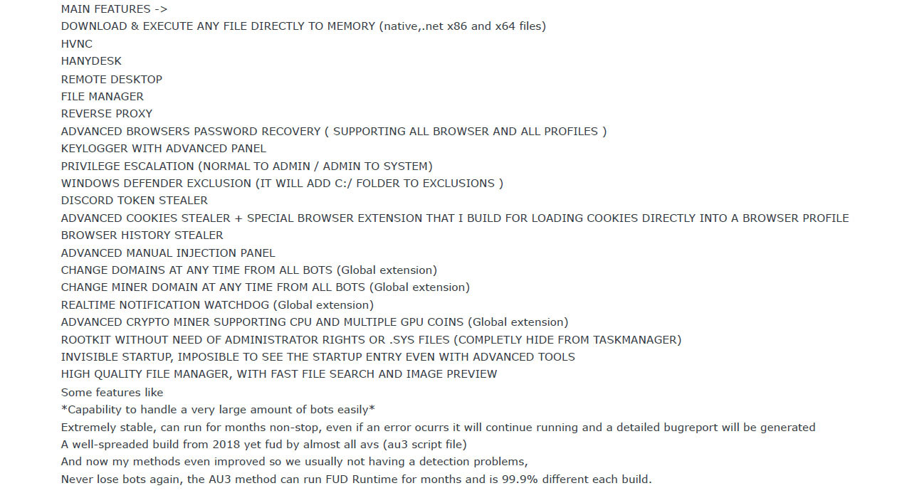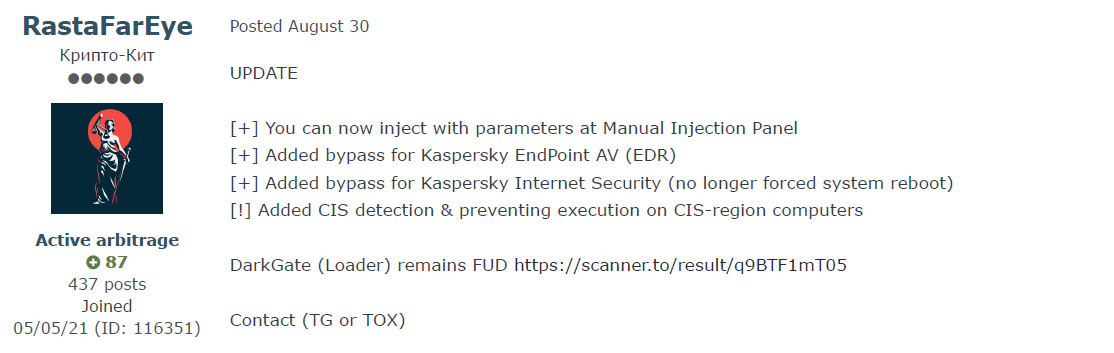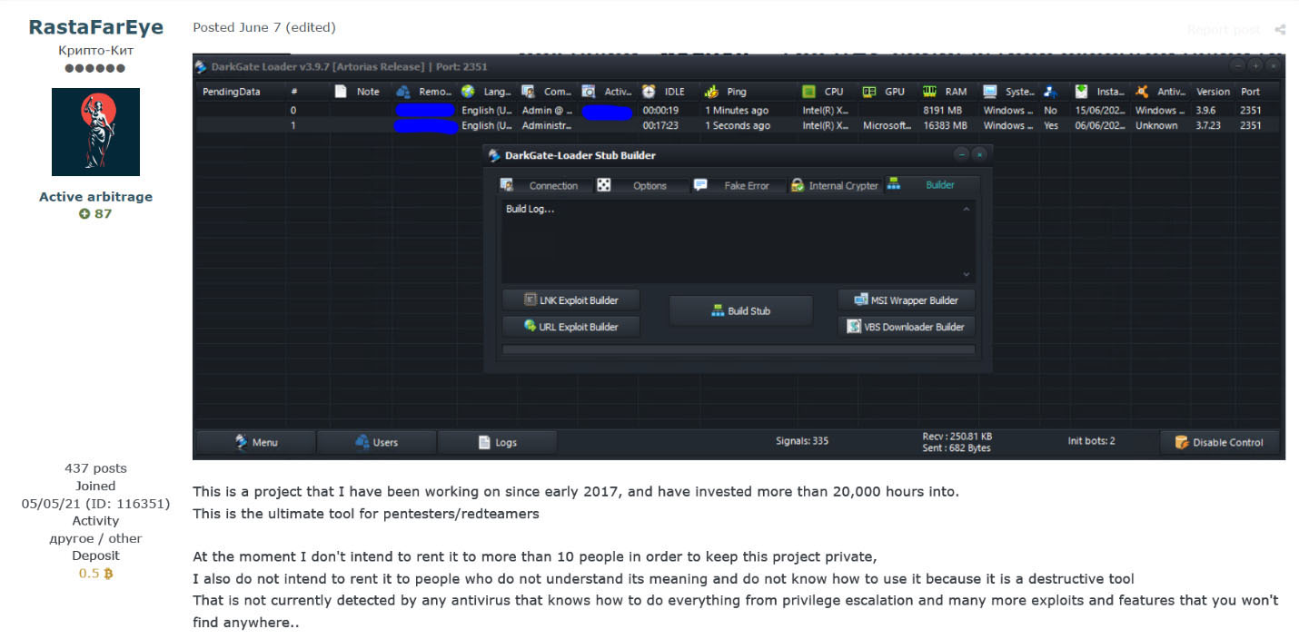 In June 2023, RastaFarEye advertised the latest version of DarkGate on the forums mentioned earlier, including new features such as hVNC, file manager, Discord and Browser stealer, keylogger, and a rootkit module, etc. The developer promised total evasion of any security products, with a complete command and control panel for convenient control of the bots by buyers.