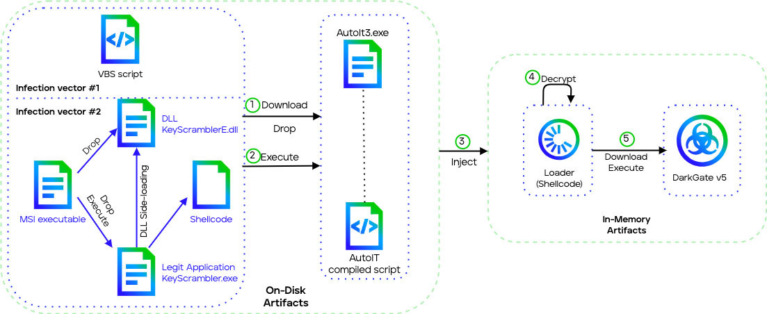DarkGate version 5 introduces a new execution chain using DLL side-loading and enhanced shellcodes and loaders. However, it retains some version 4 features including VBS/MSI initial stages and AutoIT scripts.
