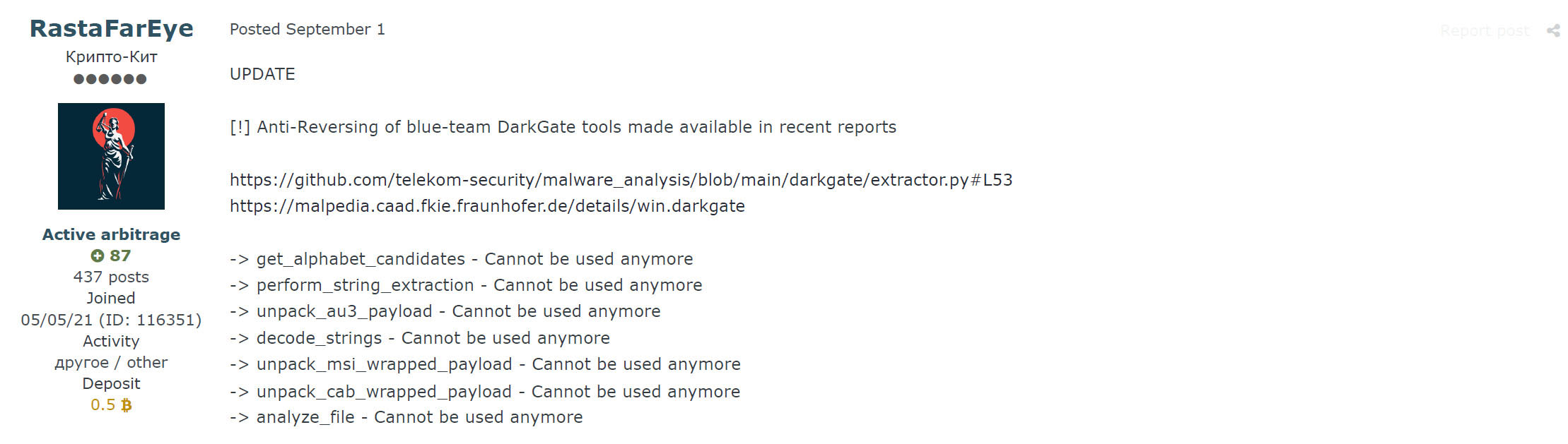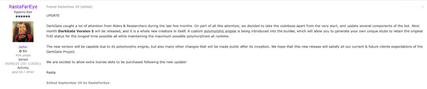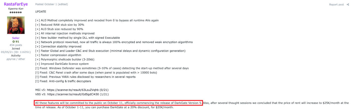RastaFarEye continually pushes minor DarkGate updates to evade antivirus detections, introduce new features, and fix bugs. On September 29th RastaFarEye announced that he was working on the next major version of DarkGate, version 5, to be released during October due to growing attention on the malware from security vendors and researchers. This release was advertised to be big, with a complete rework of the main code.