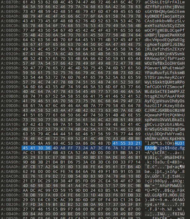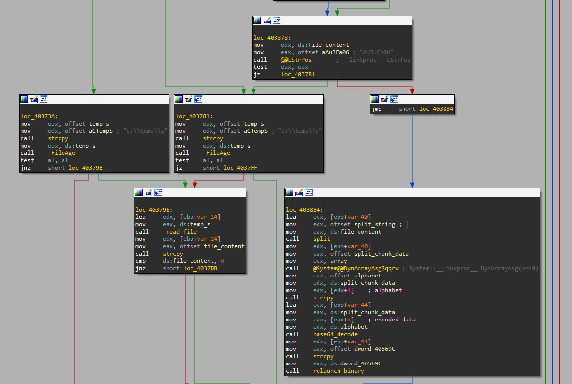 Later versions (4.17b) employ custom Base64 decoding using a custom alphabet to decode the last stage. It uses the second data chunk as the alphabet and the third split as the encoded file.