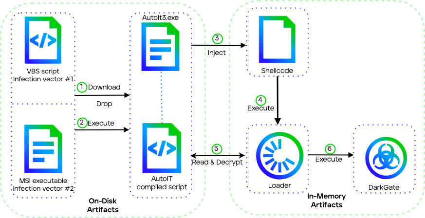 DarkGate version 4 execution chain starts with either a VBS script or a MSI file, which will drop and execute further stages. Regardless of the infection vectors, the following stages stay the same.