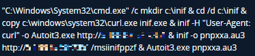 The batch script creates a directory with a random name in "C:\" root drive, copies and renames the Windows "curl" utility into this folder. It then leverages the renamed curl to download a legitimate AutoIT executable and a compiled AutoIT script from the C&C to execute it.