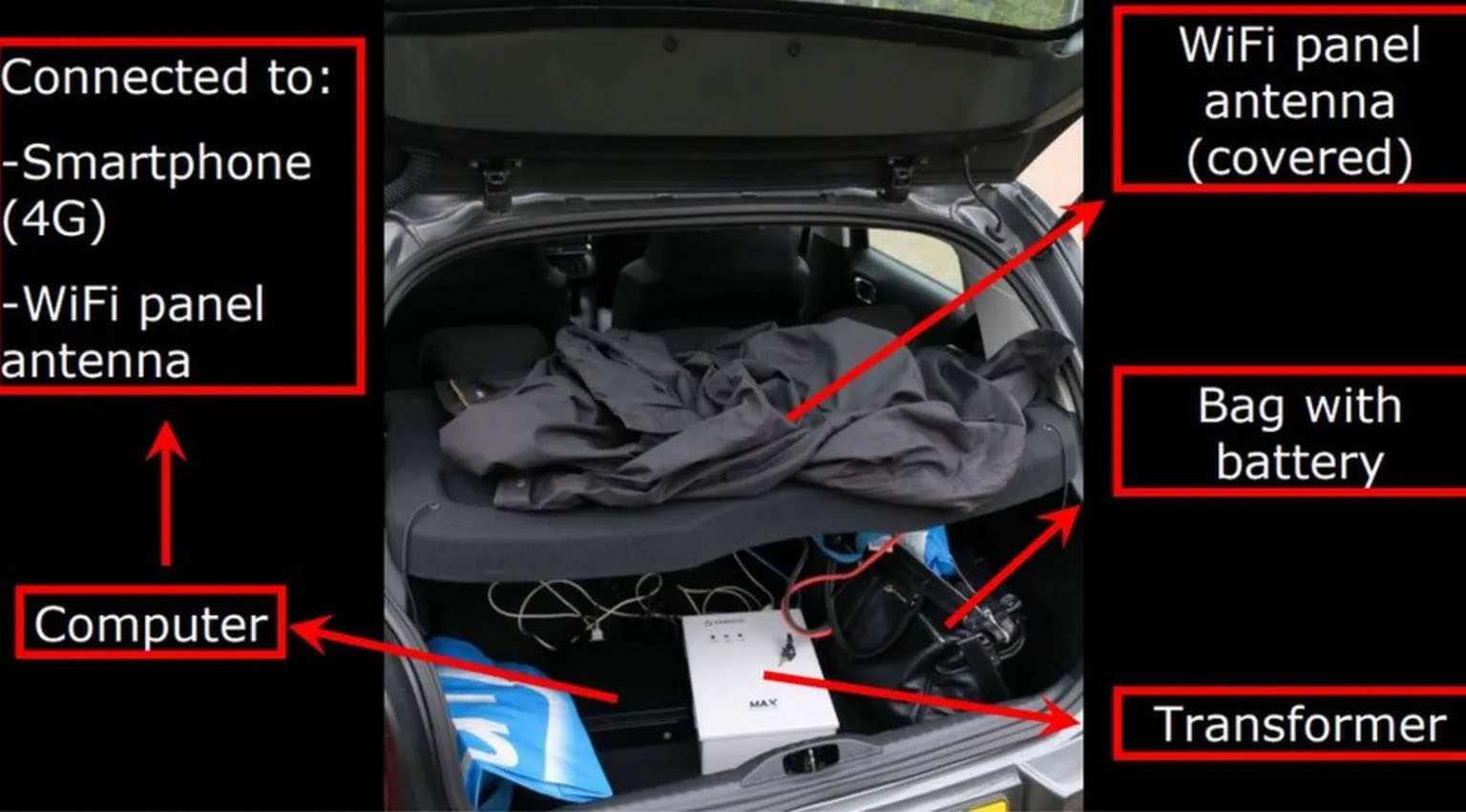 - Specialized antennas and a Wi-Fi transceiver concealed in the trunk of a rented Citroën hatchback.