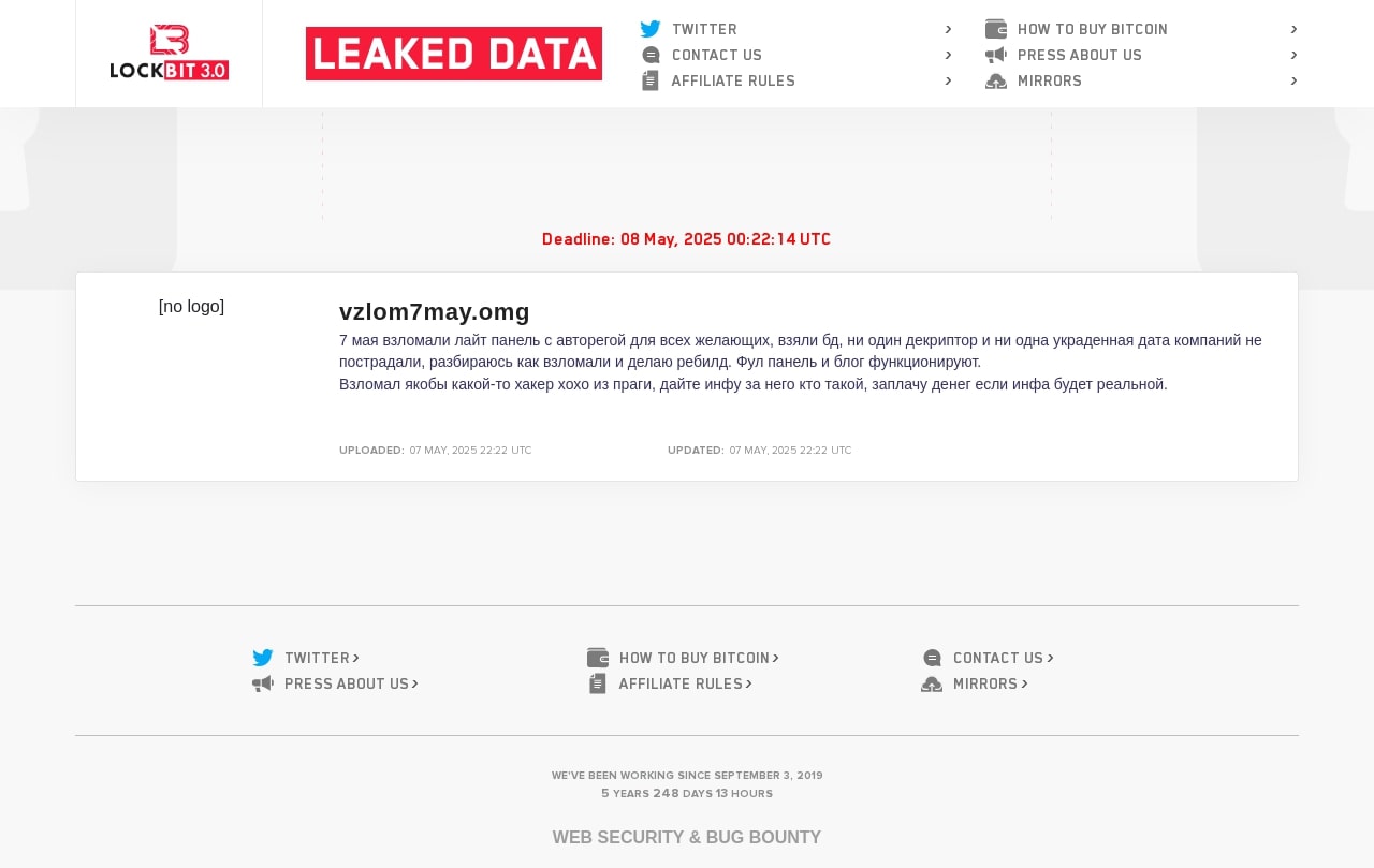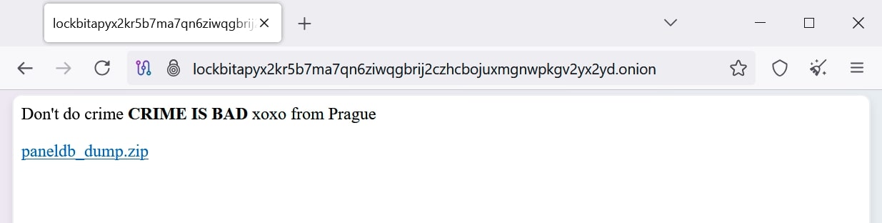 On May 7, 2025, the LockBit admin panel was hacked by an anonymous actor who replaced their TOR website with the text ‘Don’t do crime CRIME IS BAD xoxo from Prague’ and shared a SQL dump of their admin panel database in an archived file ‘paneldb_dump.zip’: