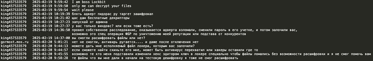 It appears that two LockBit adverts king457533579 and amleto encrypted two Russian government entities, namely the Department of Bridge Constructions of Moscow (gormost.mos.ru) and Municipality of Chebarcul (chebarcul.ru). In both of the cases, LockBit apologized and provided the decryptors for free saying ‘these are tricks and doings of our competitors’ or that the related advert’s account was hacked and their password changed, potentially indicating FBI’s operation to undermine LockBit’s reputation and set them up.It seems that in the case of gormost.mos.ru ransomware attack performed by king457533579, the victim organization was not able to decrypt the files and the LockBit operator himself, who took over the negotiation, advised ‘people who set me up changed the key in the locker using hex editor so that the file can't be decrypted and I could not help you out’: