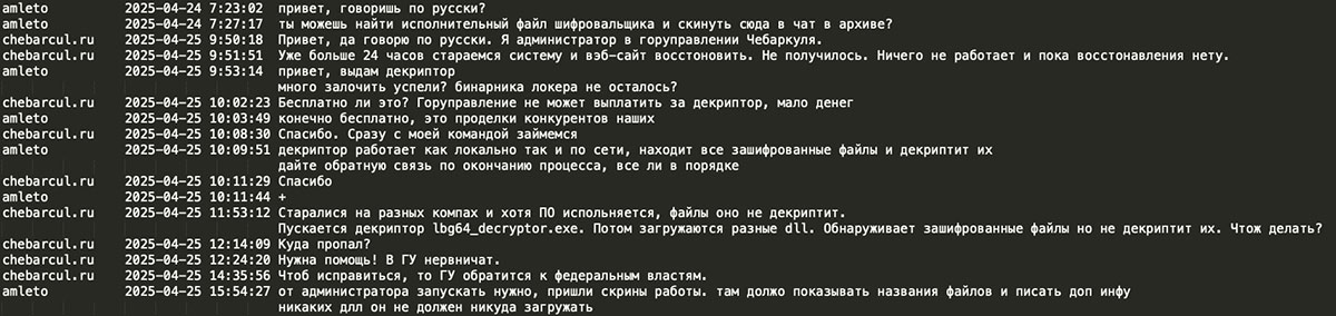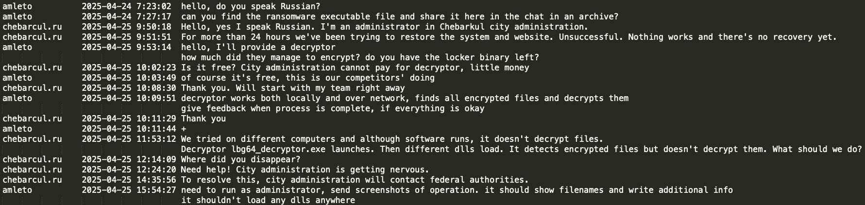 In the case of chebarcul.ru, the victim was informed they would get the decryption for free, however the provided decryptor did not work and the municipality administration became nervous, saying to amleto ‘help us to recover, otherwise we will contact (Russian) Federal Authorities’: