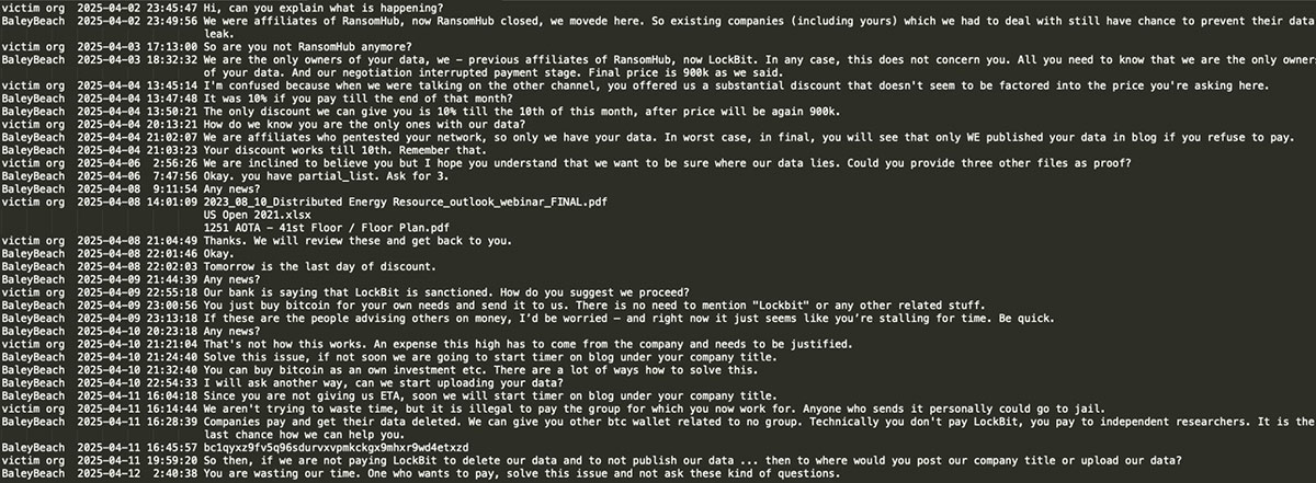 Following the discontinuation of the RansomHUB RaaSprogram in late March 2025, leaked data suggest that certain affiliates transitioned to the LockBit RaaS platform. In fact LockBit stated they reactivated operations primarily due to persistent inquiries from the affiliates. One of those affiliates is BaleyBeach who appears to have taken the RansomHUB RaaS victim to LockBit’s platform. As per the leaked negotiation chats, BaleyBeach, who had negotiation with a victim at the beginning of April 2025, advised them that ‘RansomHUB closed and they moved to LockBit ransomware’. Furthermore, BaleyBeach informed the victim organization that ‘All you need to know is that we are the only owners of your data. Technically you don't pay LockBit, you pay independent researchers’: