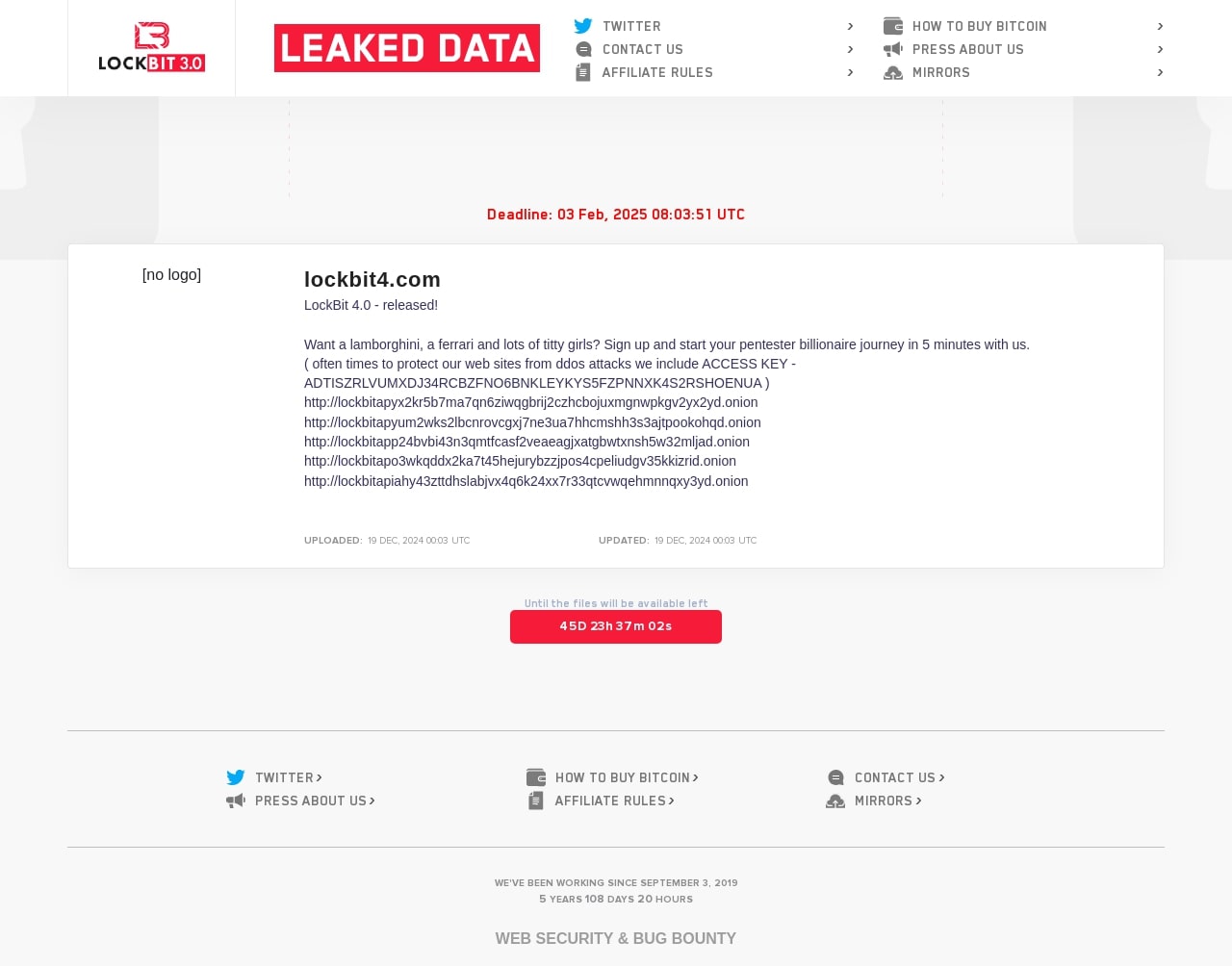Since the third phase of Operation Cronos on October 1, 2024, the Trellix Advanced Research Center has noted a decline in the operational tempo of the LockBit RaaS gang. This period of reduced activity persisted until December 19, 2024, at which time the group announced the release of their latest ransomware variant, namely LockBit 4.0: