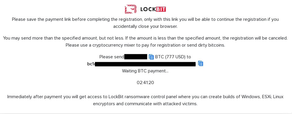 From the leaked admin panel logs, we discovered that around the same time LockBit set up their new affiliate panel they refer to as a ‘Lite’ panel. This panel features auto-registration functionality where LockBit decided to open up their admin panel to public and invite anyone who wants to work on their ‘targets’ (aka potential ransomware victim organizations) to join them for a small registration fee of $777 USD: