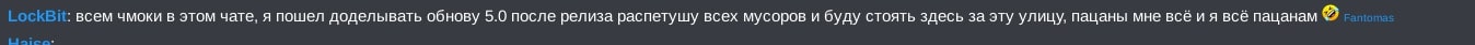 LockBit: kisses to everyone in this chat, I'm off to finish the 5.0 update, after the release I'll sing the praises of all the cops and I will stand here for this street, the guys are all to me and I all to the guys